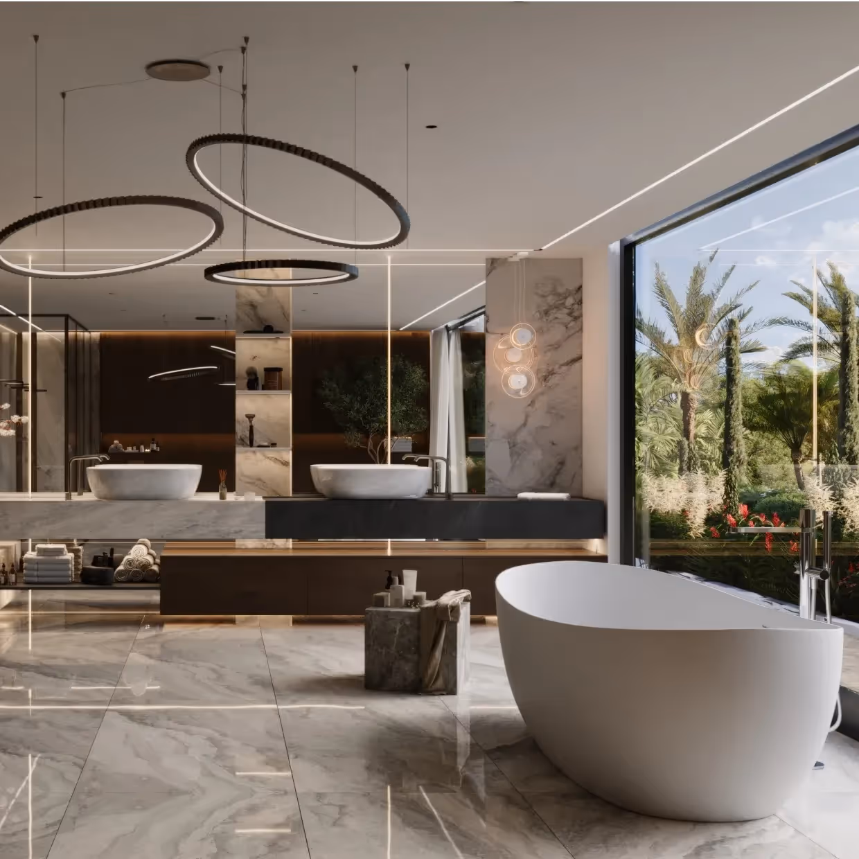 Allure’s massing extends horizontally across the site, defined by limestone planes, oak cladding, and rooflines tuned to the sun. Deep overhangs provide natural shading, while panoramic glazing opens the interiors to the landscape and coastal light.