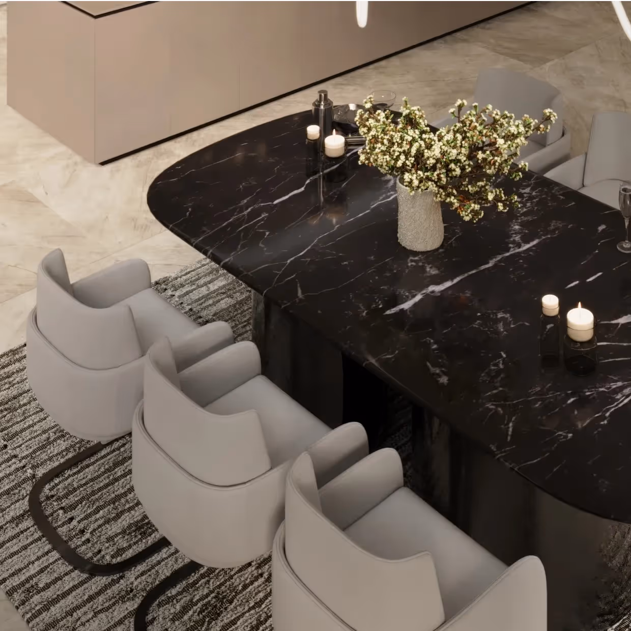 Inside, the palette is warm and grounded: textured stone, soft oak, muted bronze, and filtered natural light. The great room blends living, dining, and kitchen zones into an uninterrupted social space with strong visual coherence.