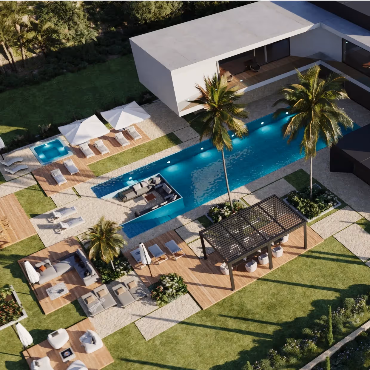 The pool terrace, shaded lounges, fire features, and landscaped pathways all converge to create an outdoor environment that complements daily life.